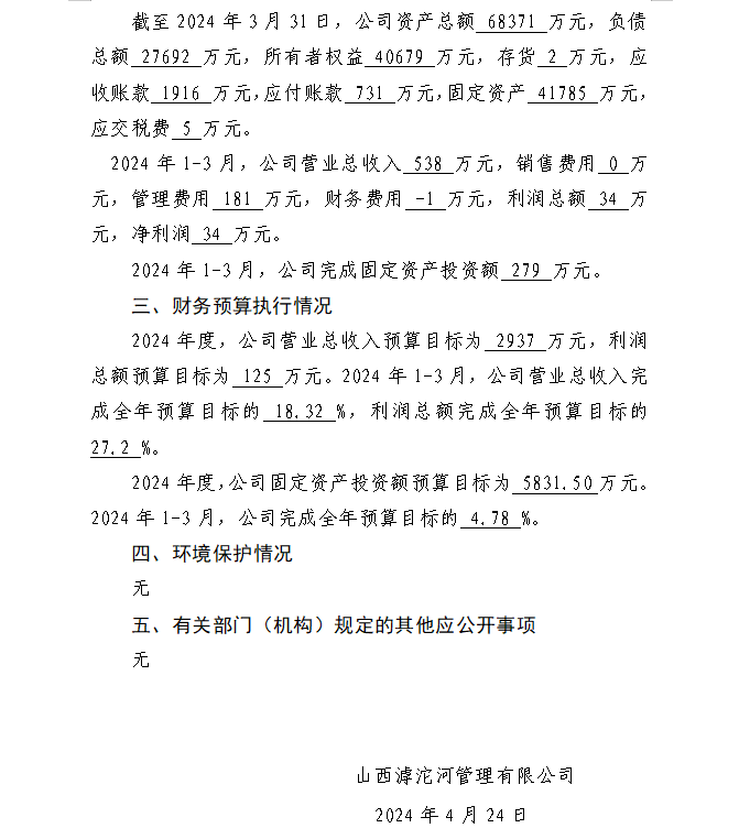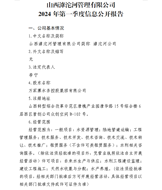 山西沁河水務(wù)集團(tuán)有限公司2024年第一季度信息公開...